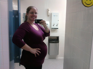 Yeah, it's a crappy looking picture, but I was trying to take it quickly because someone else was in there. :-) I'm feeling really good. My ribs are starting to get sore. I thought people were nuts for complaining about that, but dang it hurts. Nuggy is breech (well as of Thursday) and I can tell. The kicks to the cervix at the same time getting punched in the ribs is an interesting feeling. I love it! Tomorrow, it will be 2 months until Nuggy's birthday (and not a day sooner!). This pregnancy is flying by. Hopefully everything continues to go smoothly and bring my baby home in 2 months.
